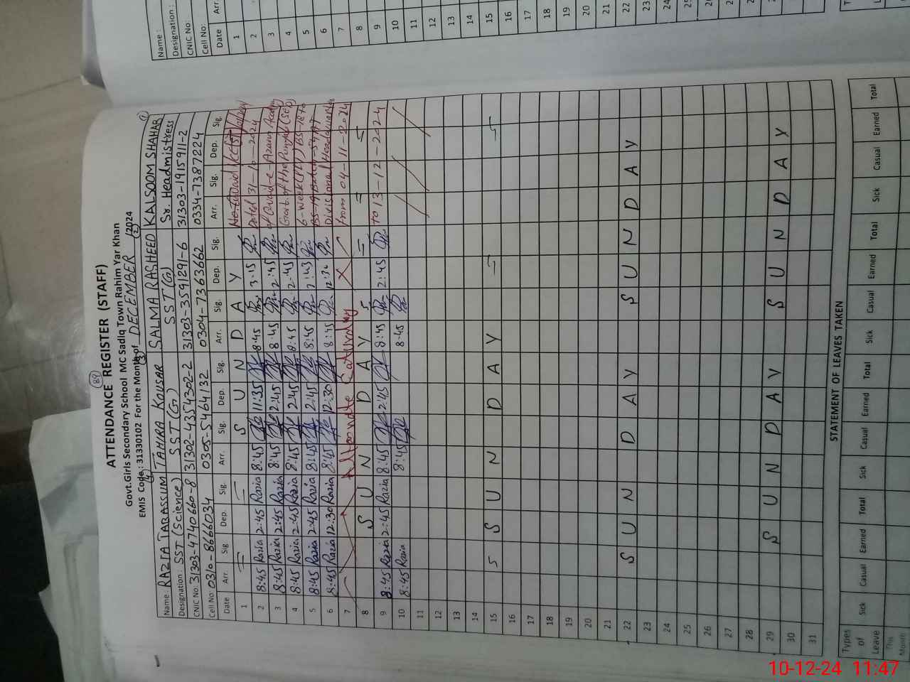 | CNIC | Full Name | Designation | R/C | Absence During Last Calender Month |