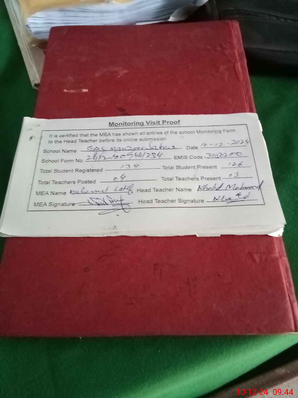 | Attendance Register | Head Teacher | MEA with School | Visit Proof |