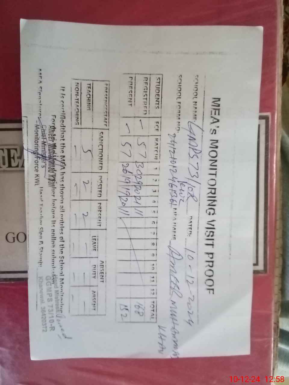 | Certified that this School was Inspected by the Undersigned MEA/DMO Today and the Information Stated Above is as Per Record. | |||||