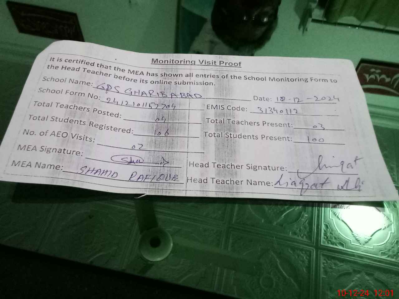 | Attendance Register | Head Teacher | MEA with School | Visit Proof |
