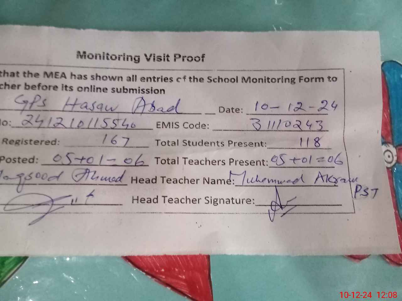 | Attendance Register | Head Teacher | MEA with School | Visit Proof |