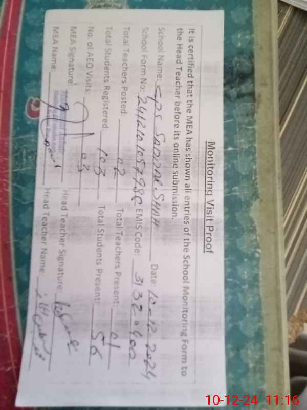 | EMIS Code: 31320400 | Name of School: GPS SADDAR SHAH | |||