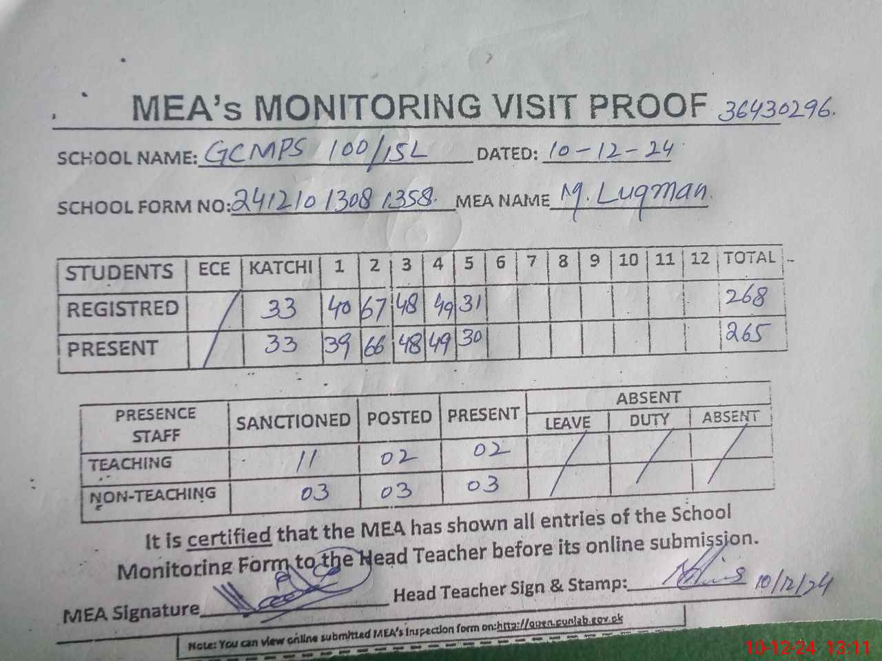 | EMIS Code: 36430296 | Name of School: GCMS 100/15-L SABQA, MIAN CHANNU | |||