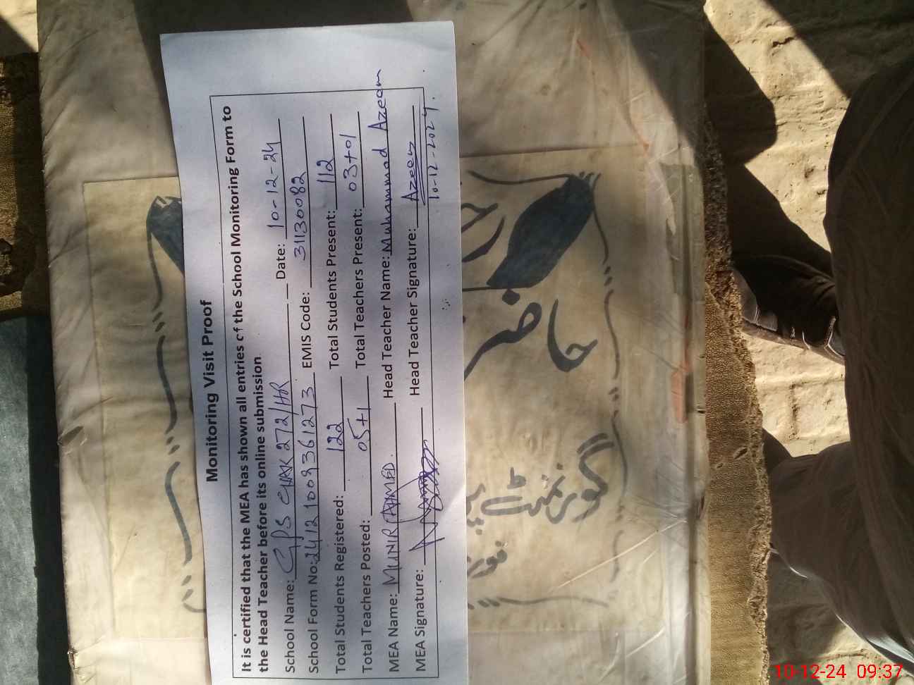 | Attendance Register | Head Teacher | MEA with School | Visit Proof |