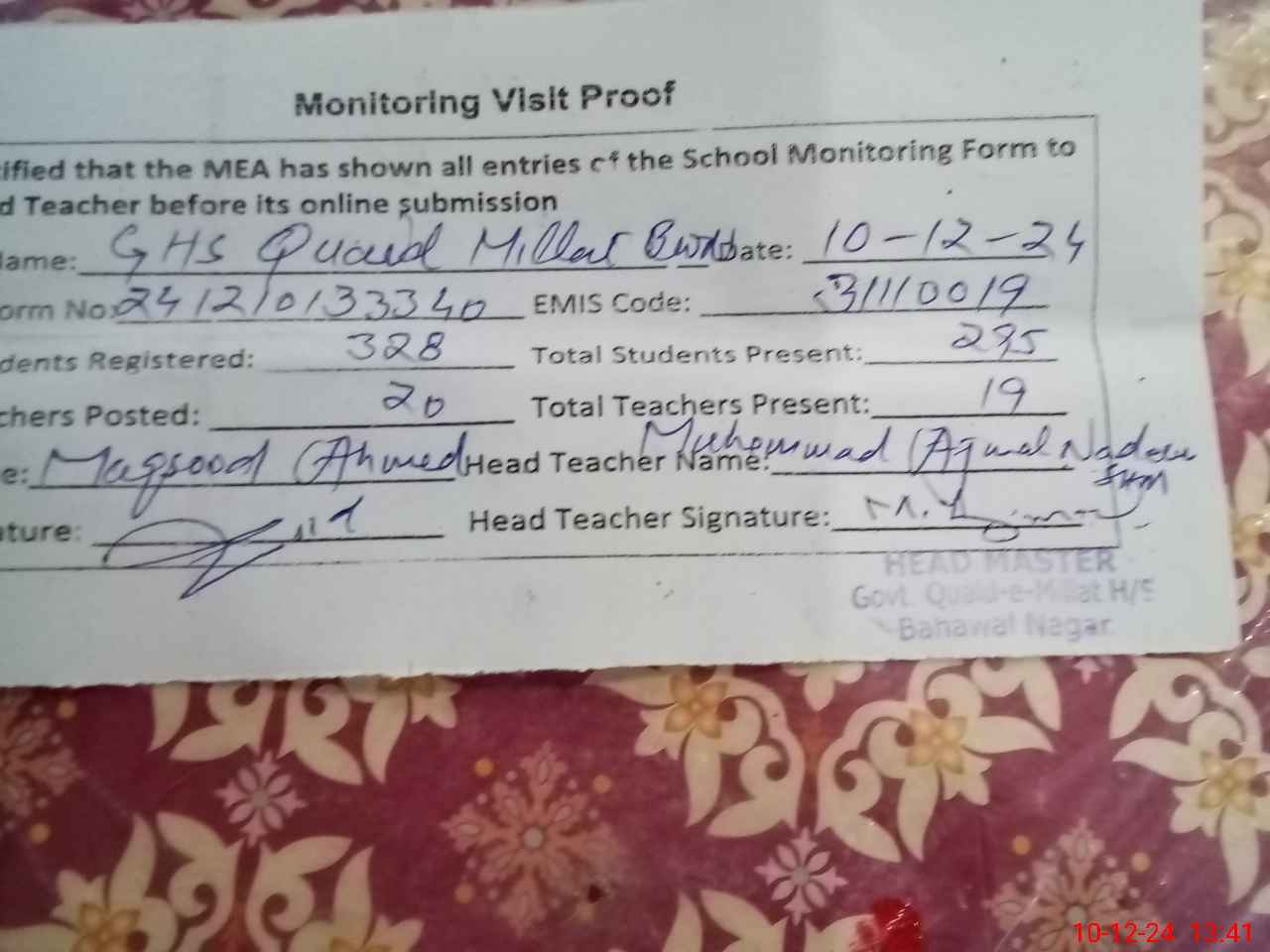 | EMIS Code: 31110019 | Name of School: GHS QUAID MILLAT BWN | |||