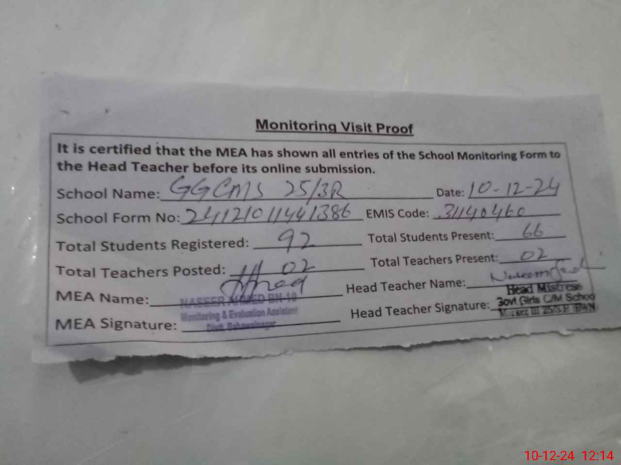 | Certified that this School was Inspected by the Undersigned MEA/DMO Today and the Information Stated Above is as Per Record. | |||||
