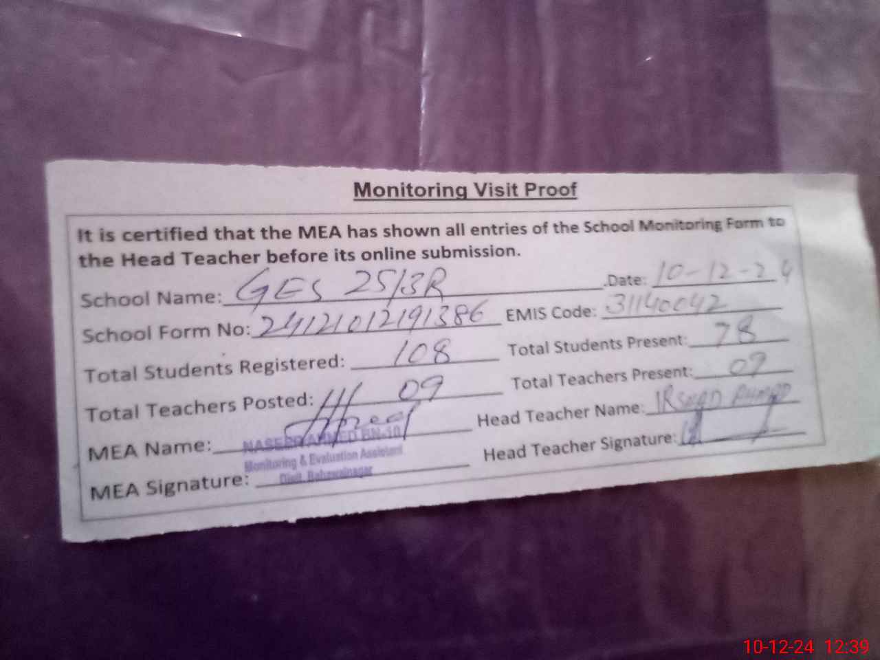 | Attendance Register | Head Teacher | MEA with School | Visit Proof |