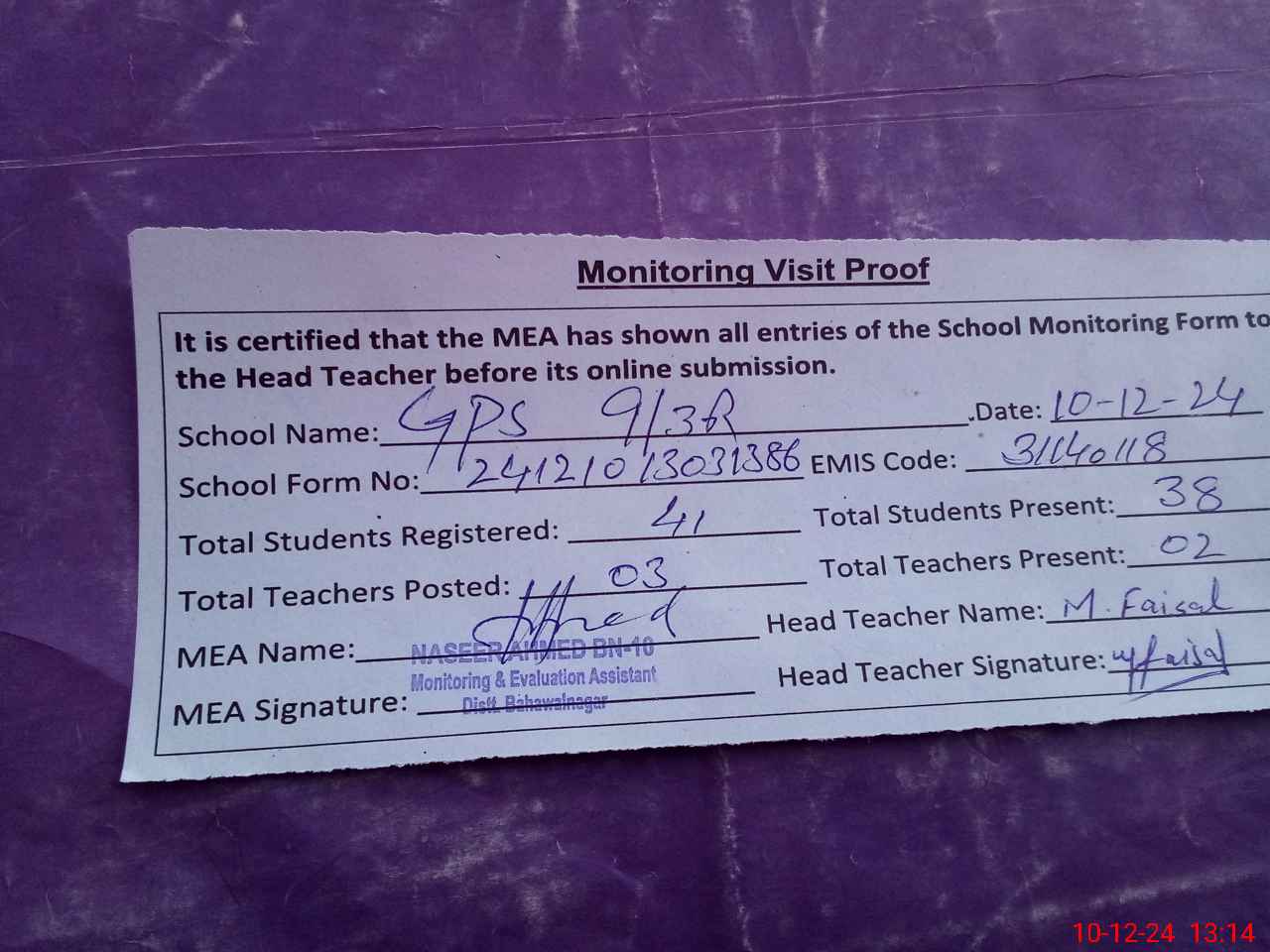 | Attendance Register | Head Teacher | MEA with School | Visit Proof |