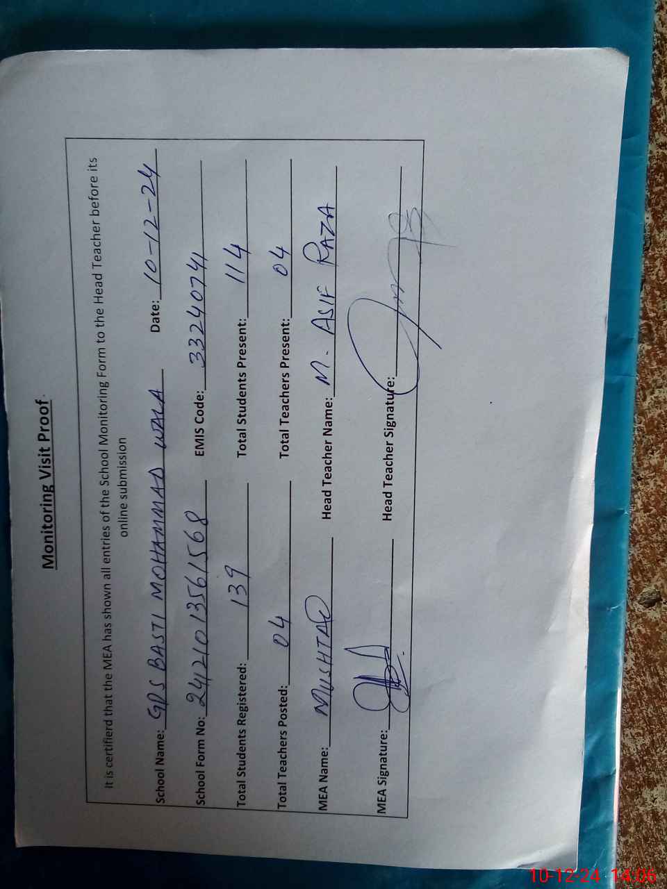 | Attendance Register | Head Teacher | MEA with School | Visit Proof |