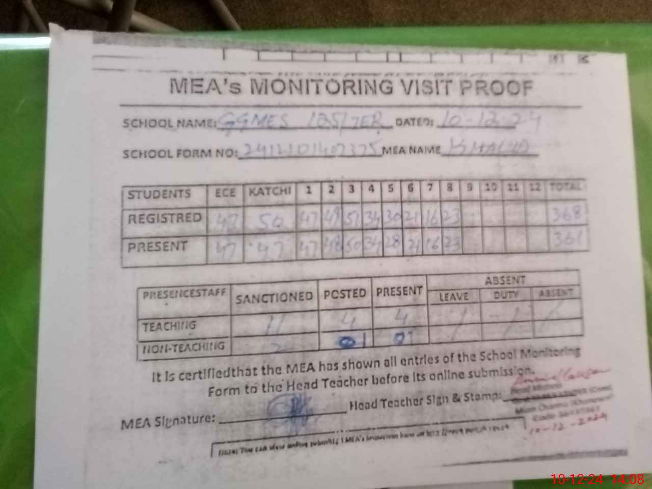 | Attendance Register | Head Teacher | MEA with School | Visit Proof |