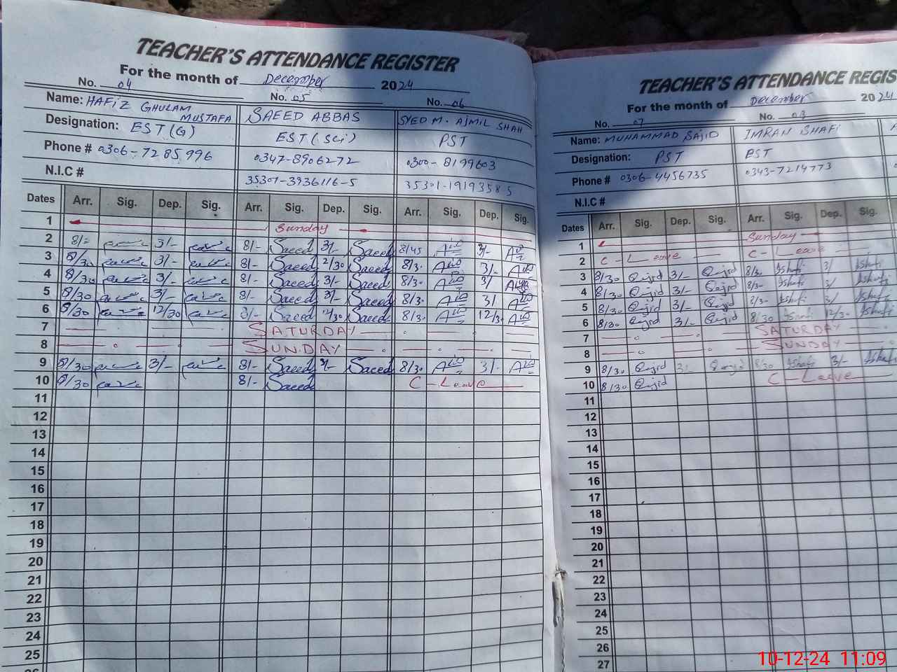 | CNIC | Full Name | Designation | R/C | Absence during last cal. month |