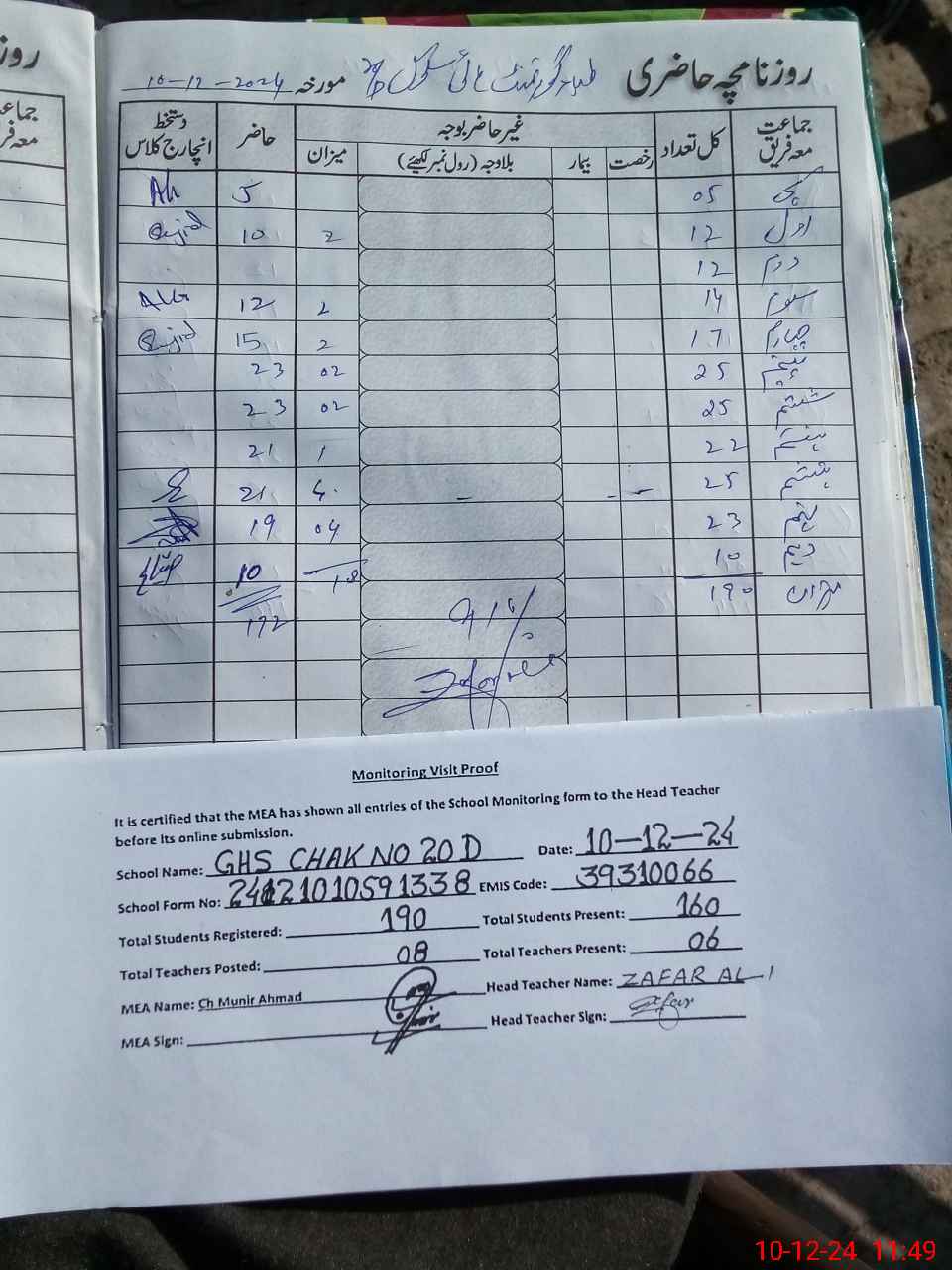 | Attendance Register | Head Teacher | MEA with School | Visit Proof |