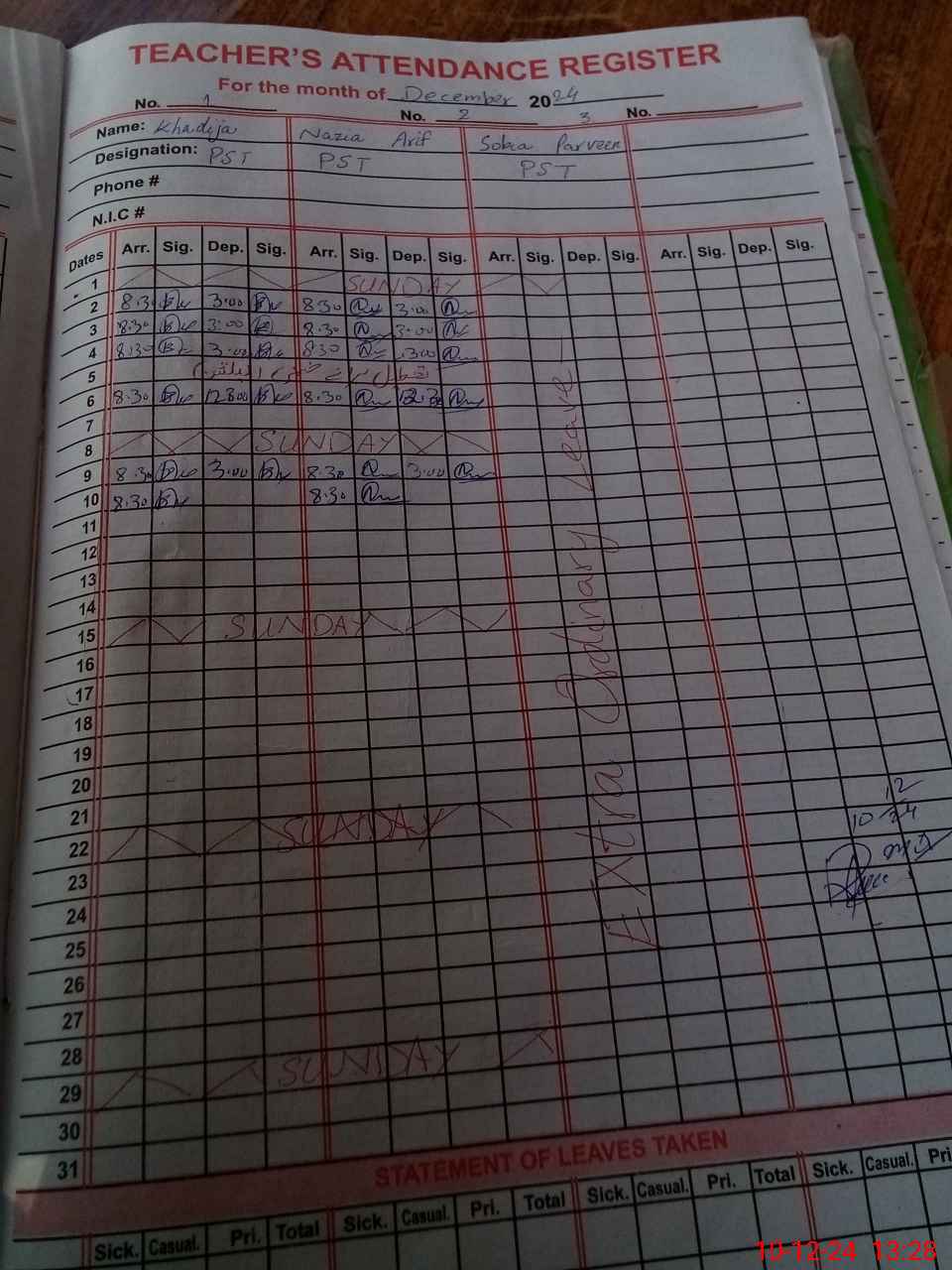 | CNIC | Full Name | Designation | R/C | Absence During Last Calender Month |