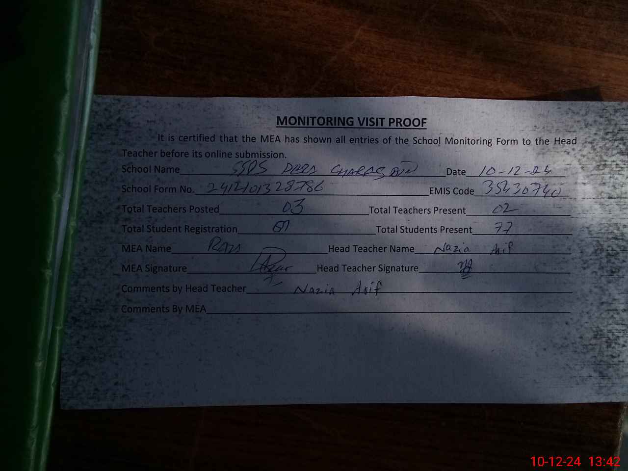 | Attendance Register | Head Teacher | MEA with School | Visit Proof |