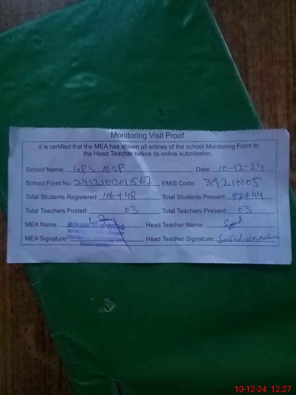 | Attendance Register | Head Teacher | MEA with School | Visit Proof |