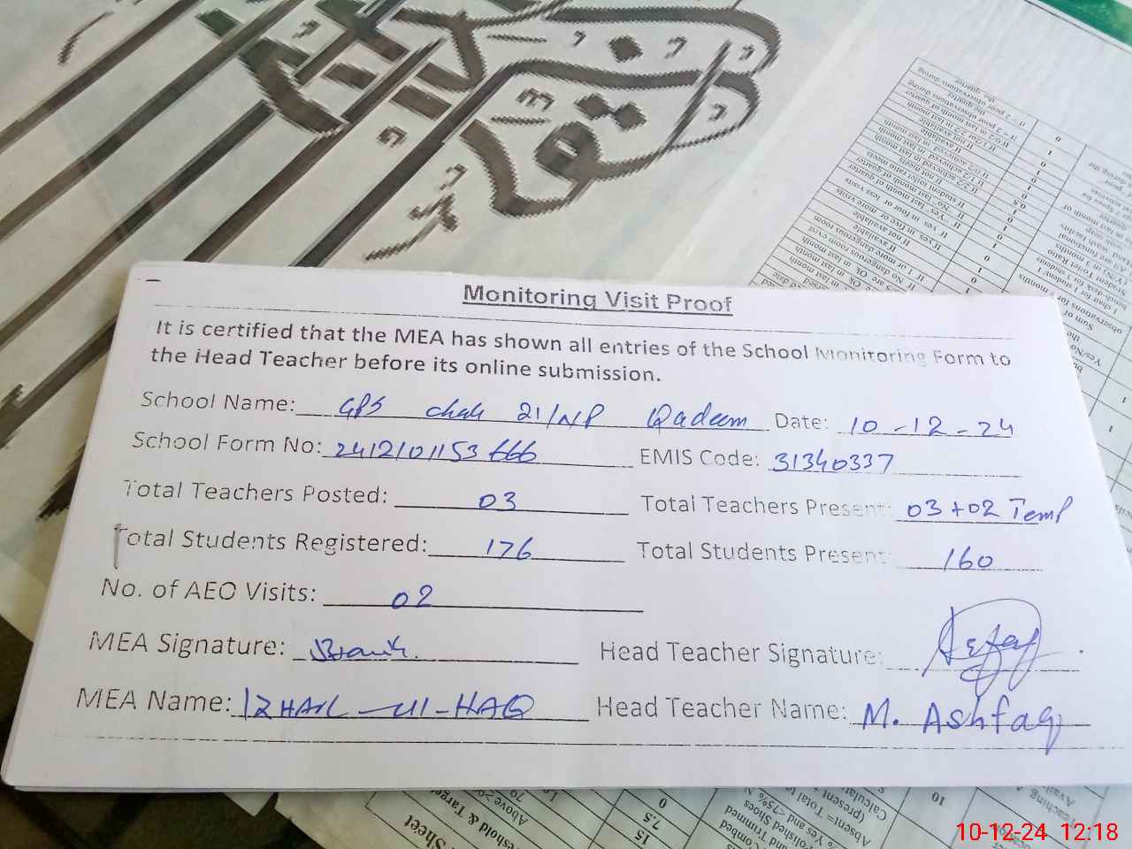 | Attendance Register | Head Teacher | MEA with School | Visit Proof |