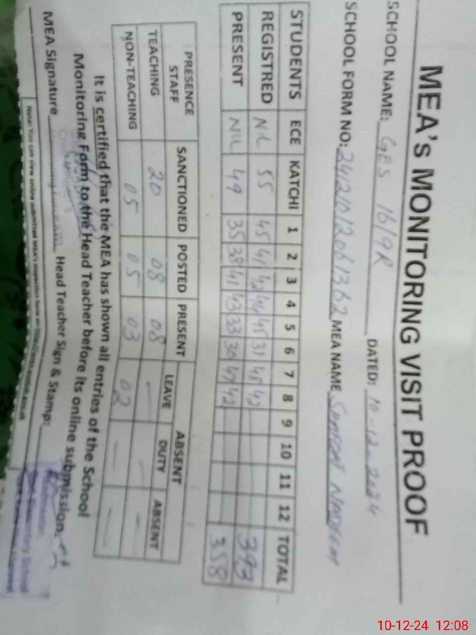 | Attendance Register | Head Teacher | MEA with School | Visit Proof |