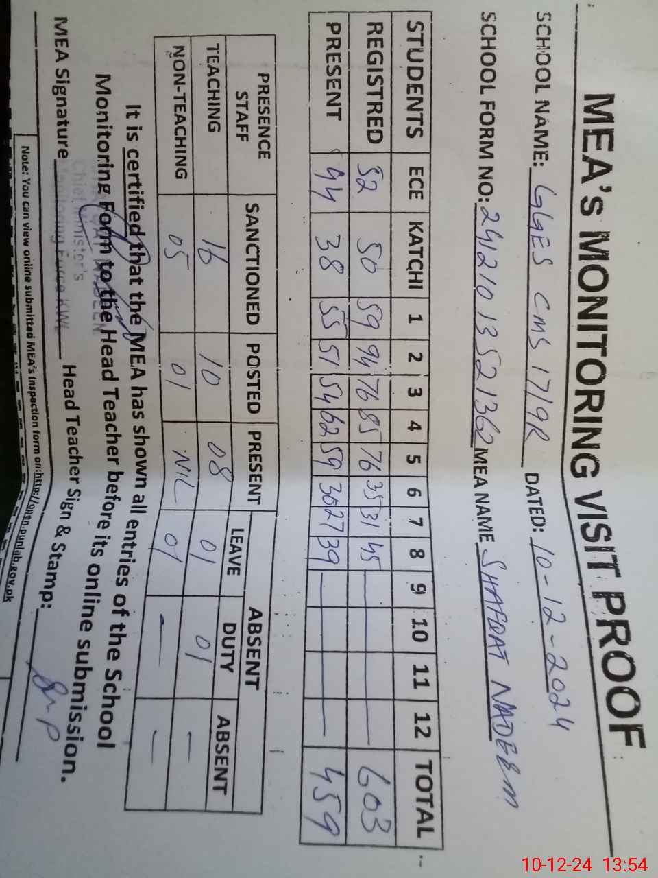 | Certified that this School was Inspected by the Undersigned MEA/DMO Today and the Information Stated Above is as Per Record. | |||||