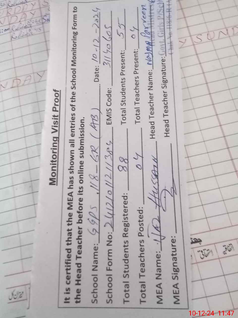 | Attendance Register | Head Teacher | MEA with School | Visit Proof |