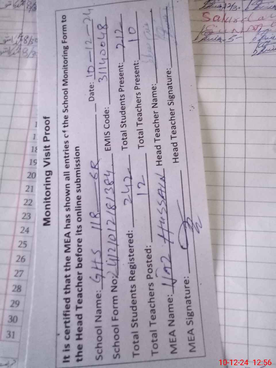 | Attendance Register | Head Teacher | MEA with School | Visit Proof |