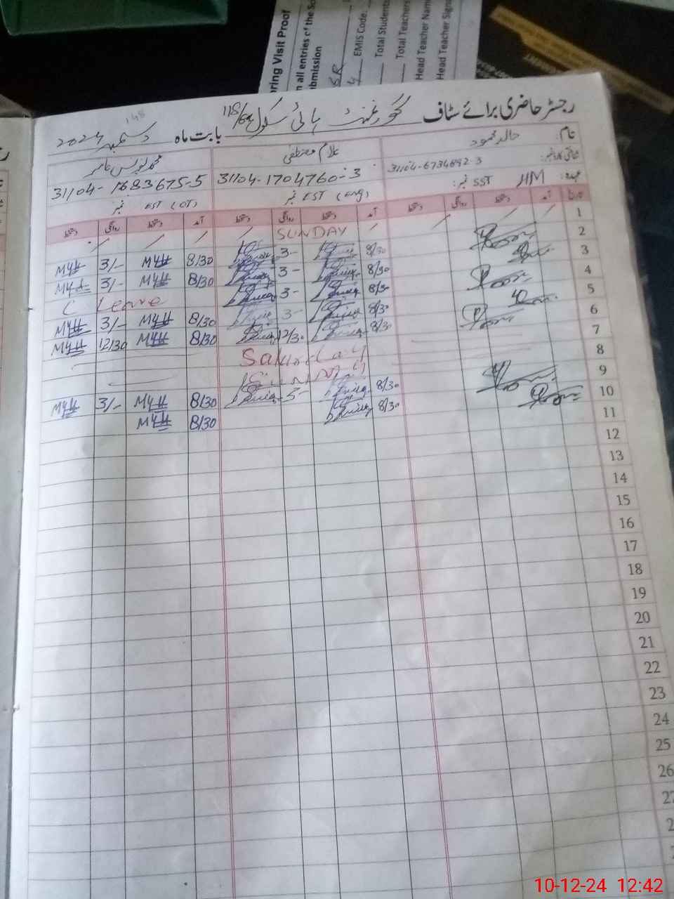 | CNIC | Full Name | Designation | R/C | Absence During Last Calender Month |