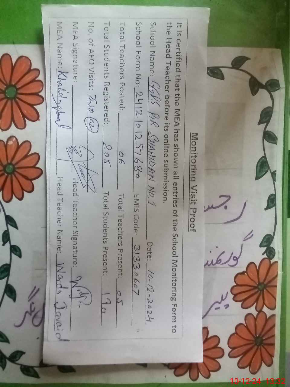 | Attendance Register | Head Teacher | MEA with School | Visit Proof |