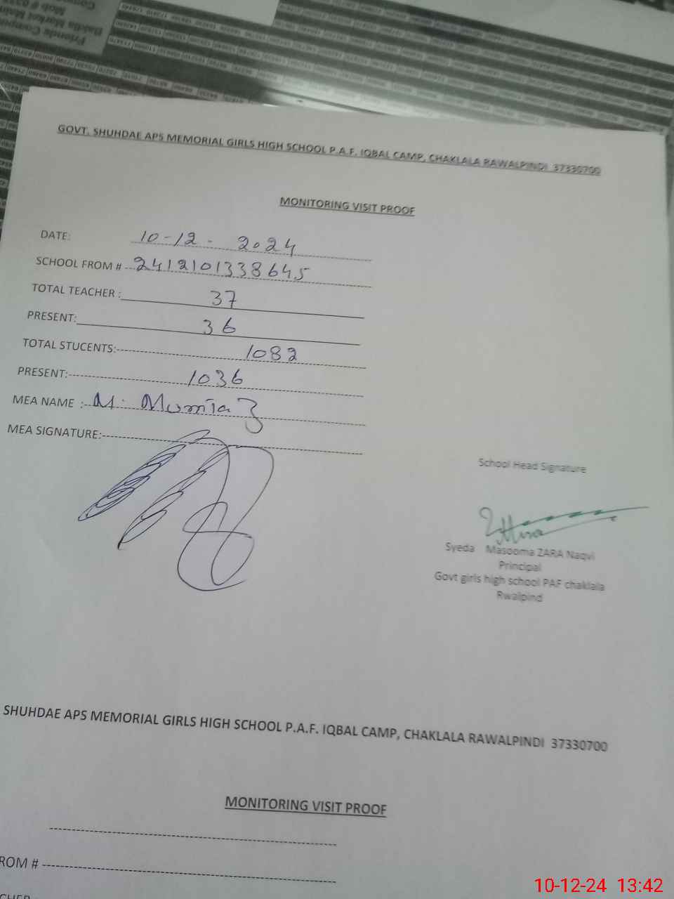| Attendance Register | Head Teacher | MEA with School | Visit Proof |