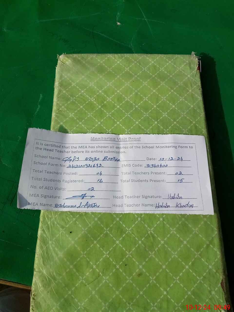 | Attendance Register | Head Teacher | MEA with School | Visit Proof |