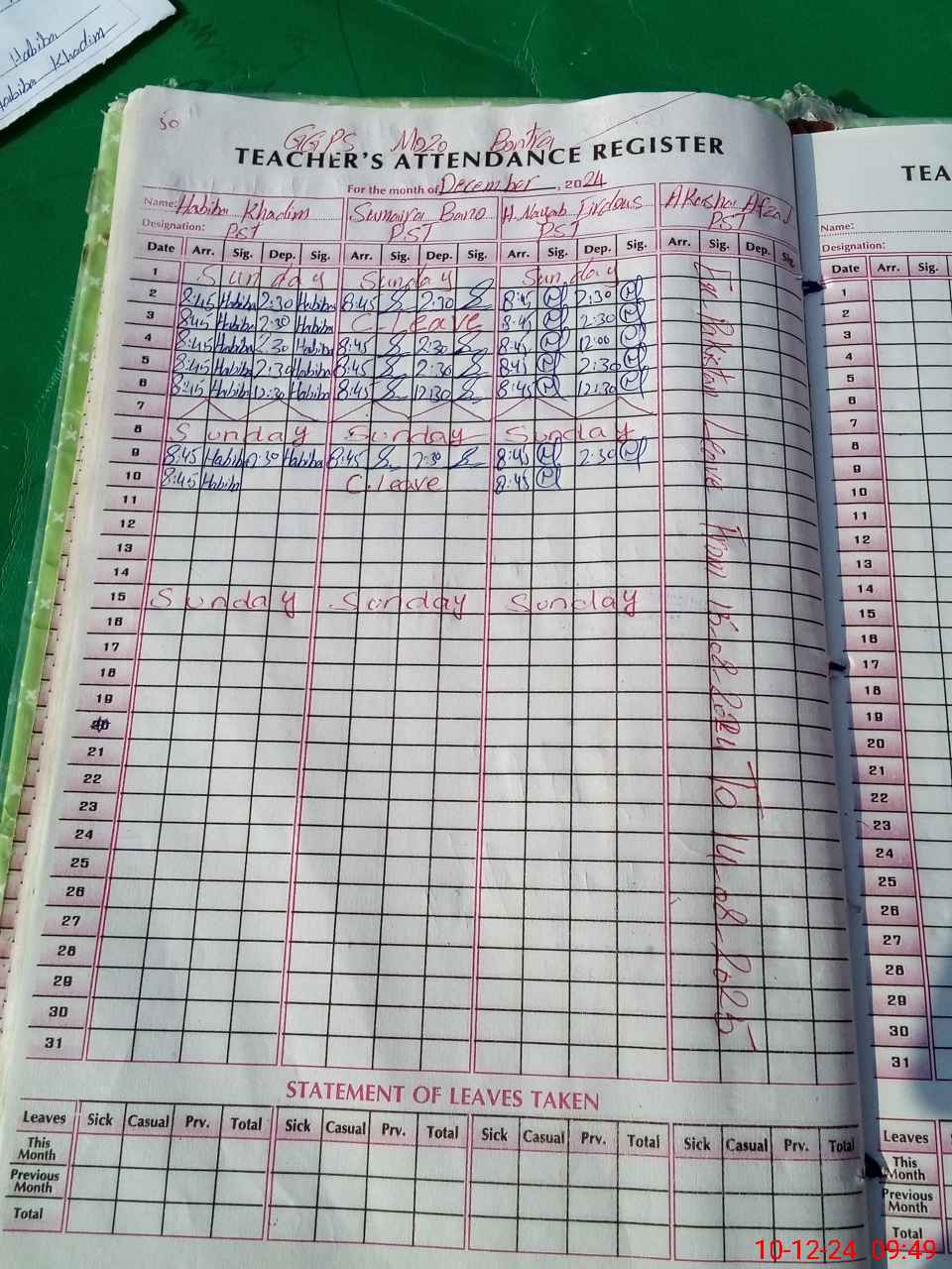 | CNIC | Full Name | Designation | R/C | Absence During Last Calender Month |