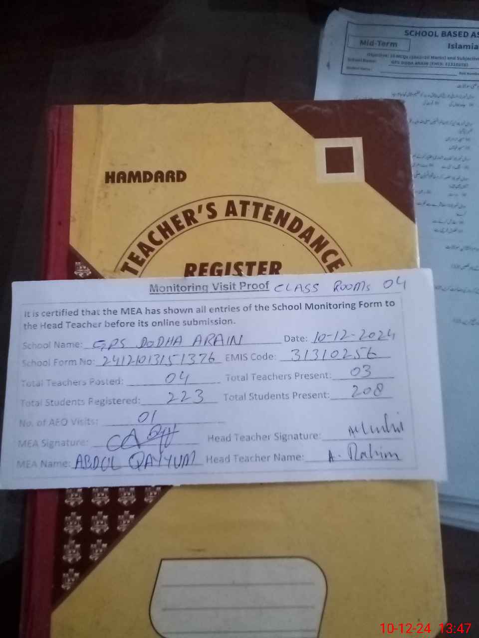 | Attendance Register | Head Teacher | MEA with School | Visit Proof |