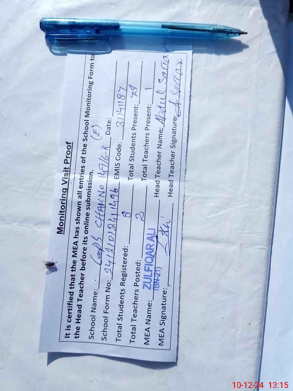 | Monitoring Date: 10-12-2024 | Start Time: 10-12-2024 12:41 PM | End Time: 10-12-2024 01:15 PM | Name of MEA: Zu**** Al**** BN**** | |