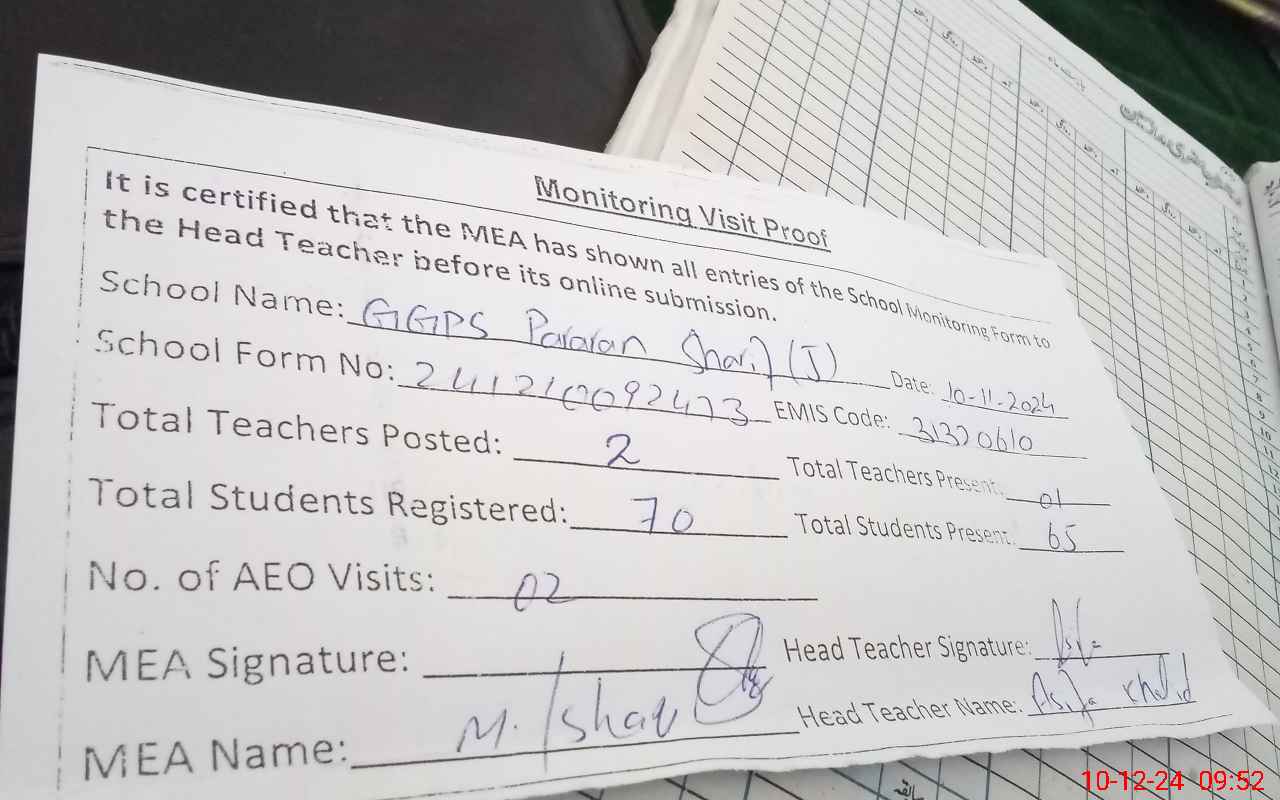 | Attendance Register | Head Teacher | MEA with School | Visit Proof |