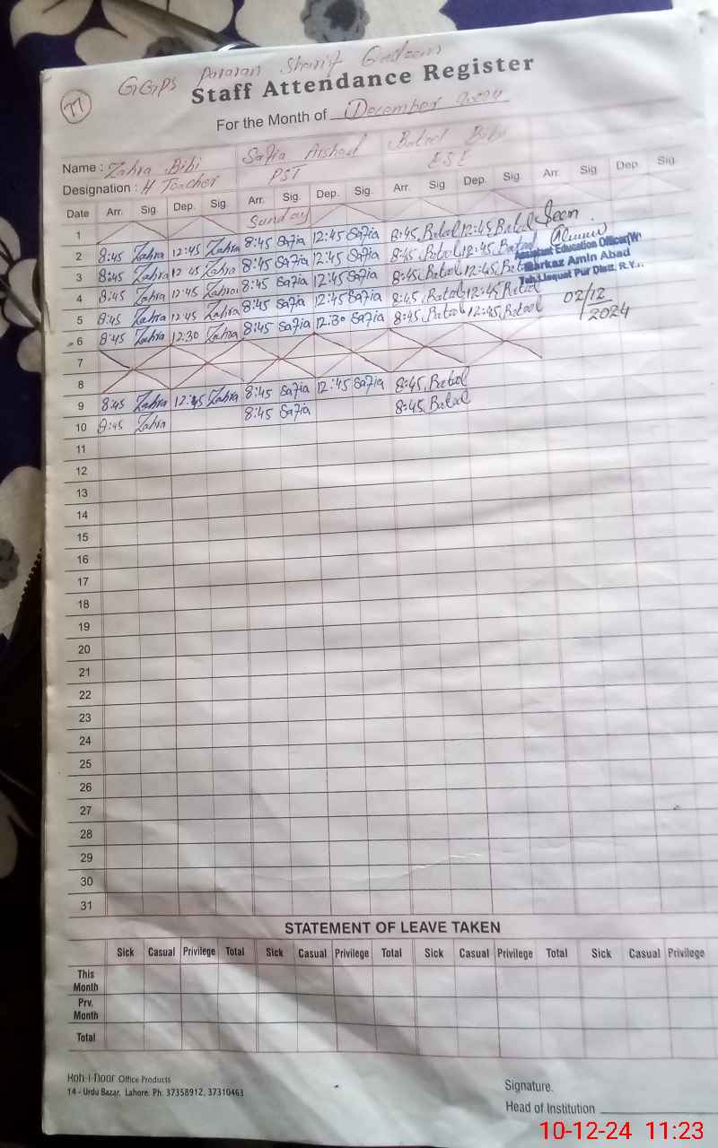 | CNIC | Full Name | Designation | R/C | Absence During Last Calender Month |