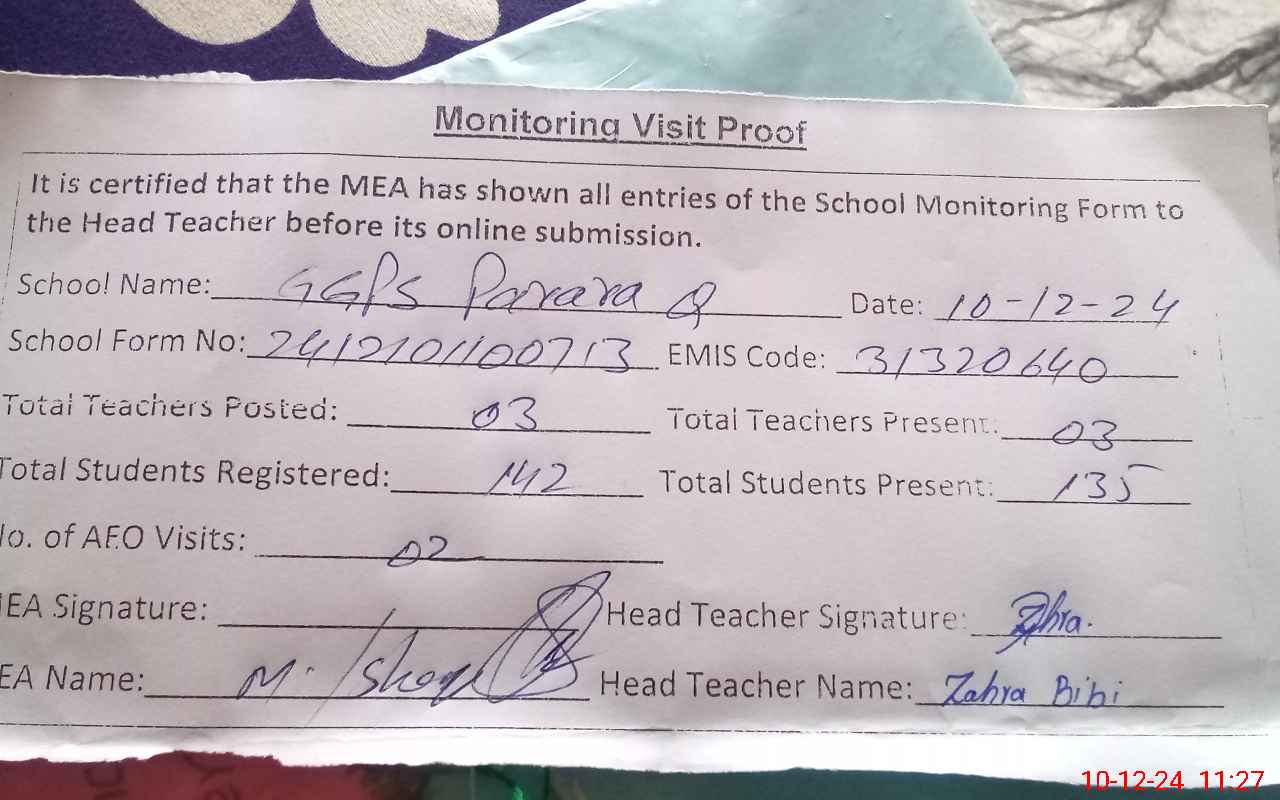 | Attendance Register | Head Teacher | MEA with School | Visit Proof |
