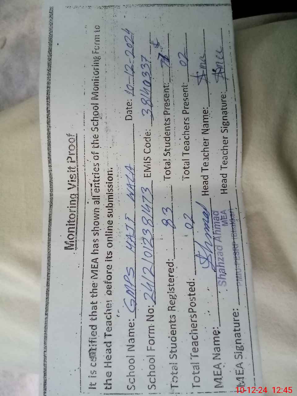 | Monitoring Date: 10-12-2024 | Start Time: 10-12-2024 12:22 PM | End Time: 10-12-2024 12:45 PM | Name of MEA: SH**** AH**** | |