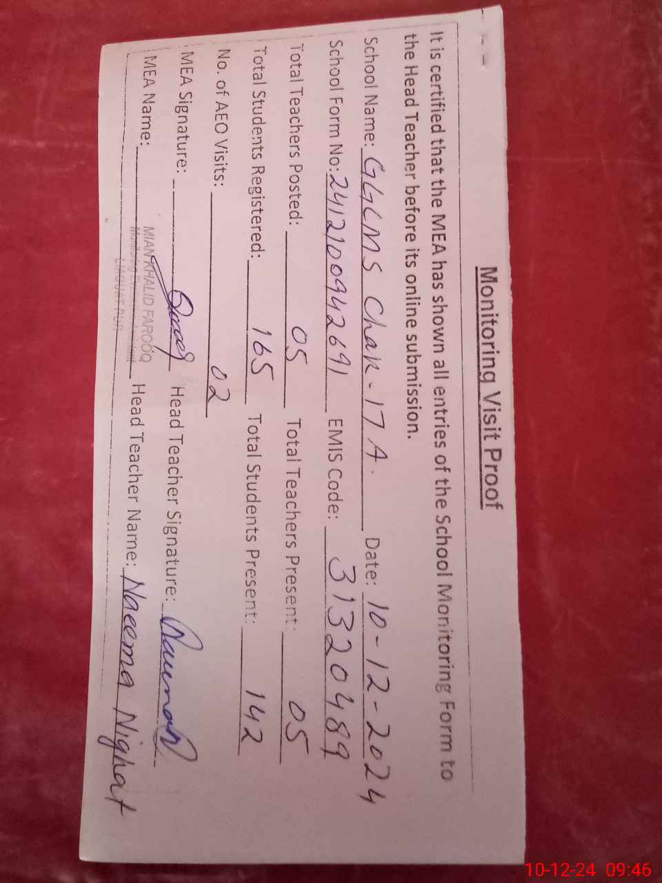 | Attendance Register | Head Teacher | MEA with School | Visit Proof |