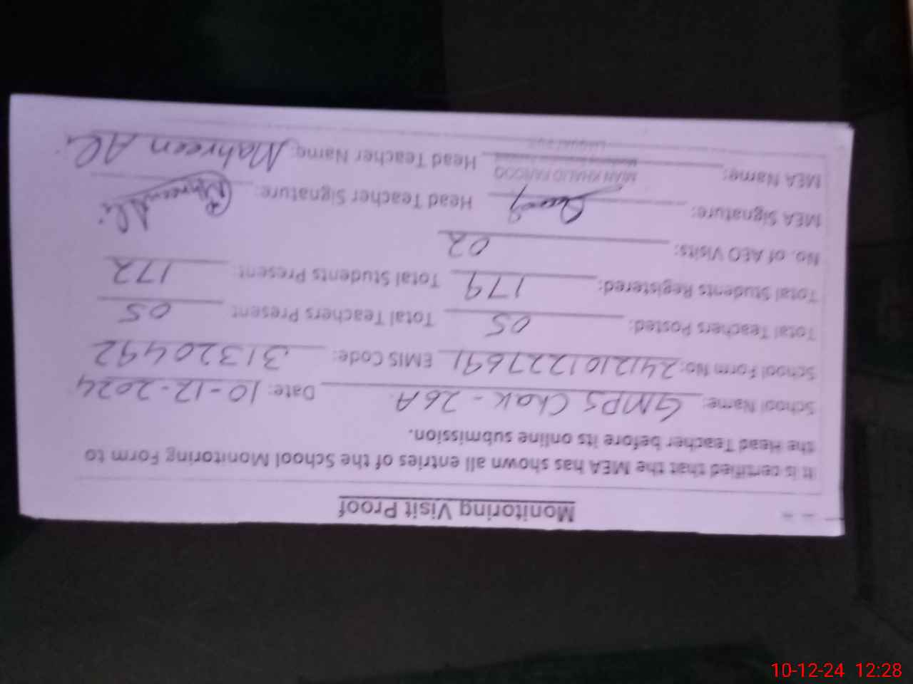 | Certified that this School was Inspected by the Undersigned MEA/DMO Today and the Information Stated Above is as Per Record. | |||||