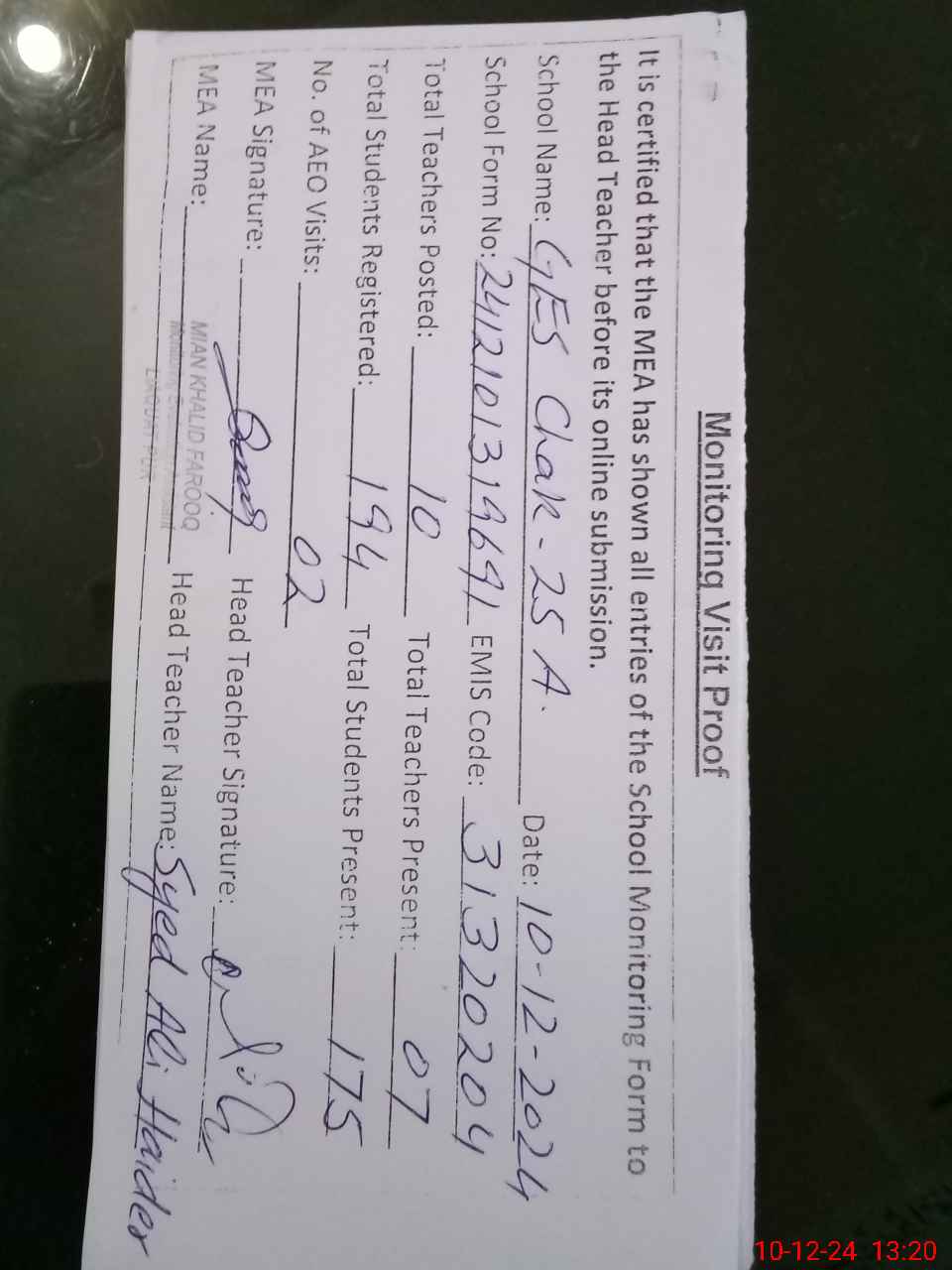 | Attendance Register | Head Teacher | MEA with School | Visit Proof |