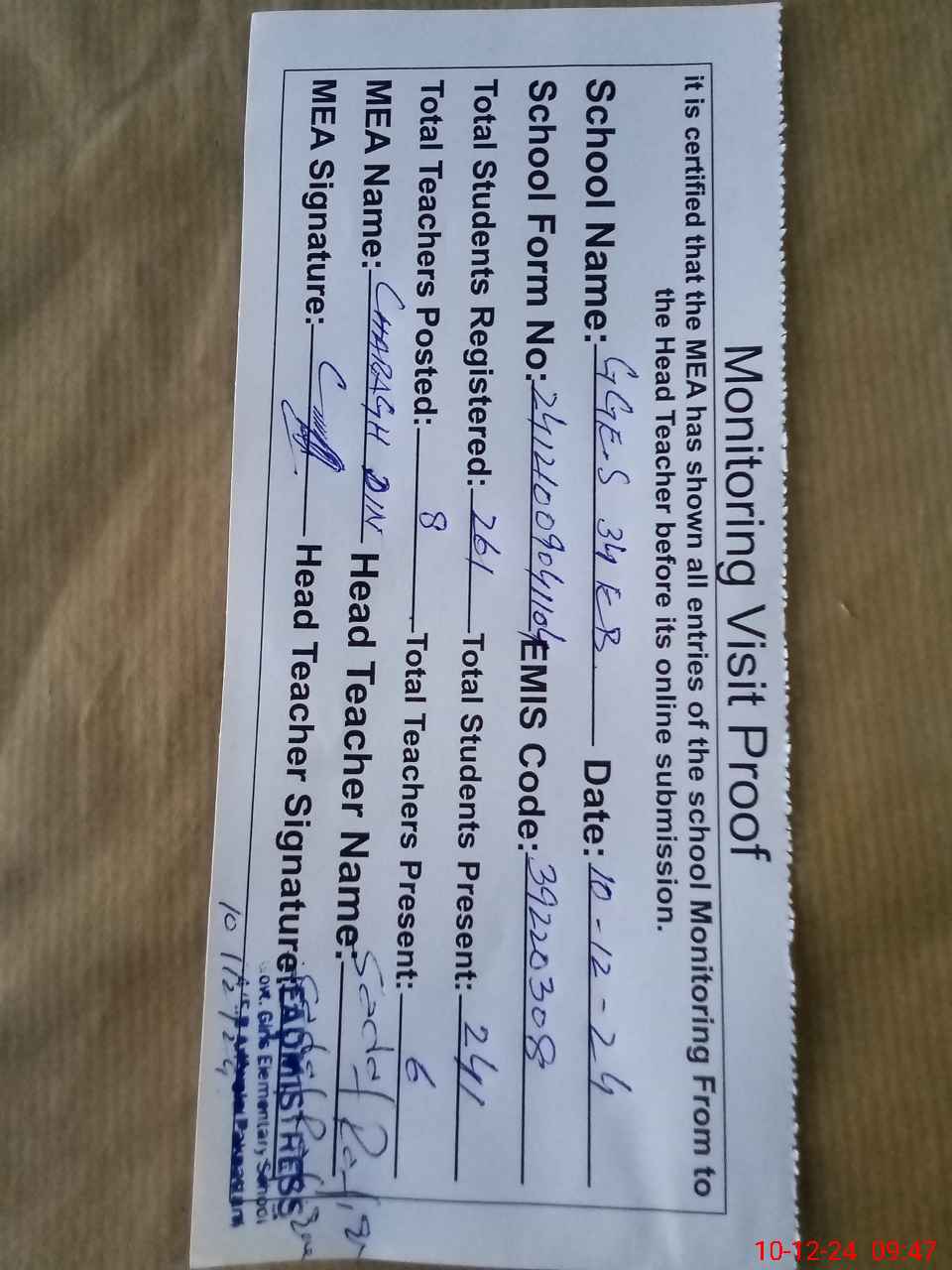 | Attendance Register | Head Teacher | MEA with School | Visit Proof |