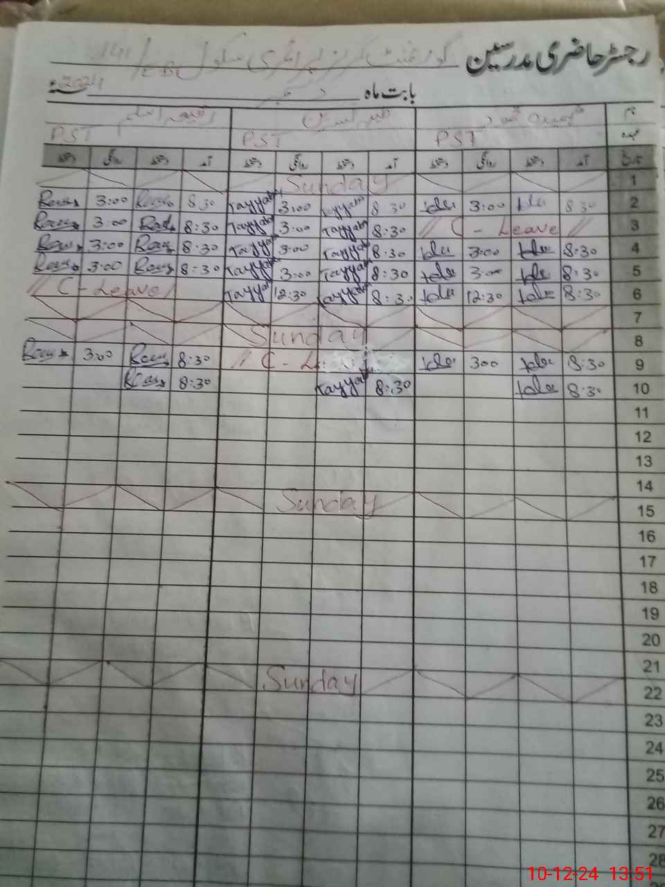 | CNIC | Full Name | Designation | R/C | Absence During Last Calender Month |