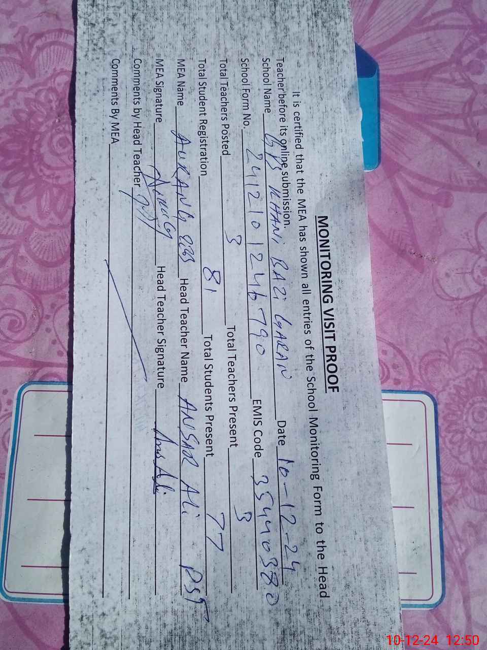 | Attendance Register | Head Teacher | MEA with School | Visit Proof |
