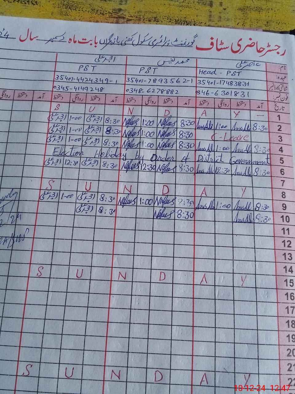 | CNIC | Full Name | Designation | R/C | Absence During Last Calender Month |