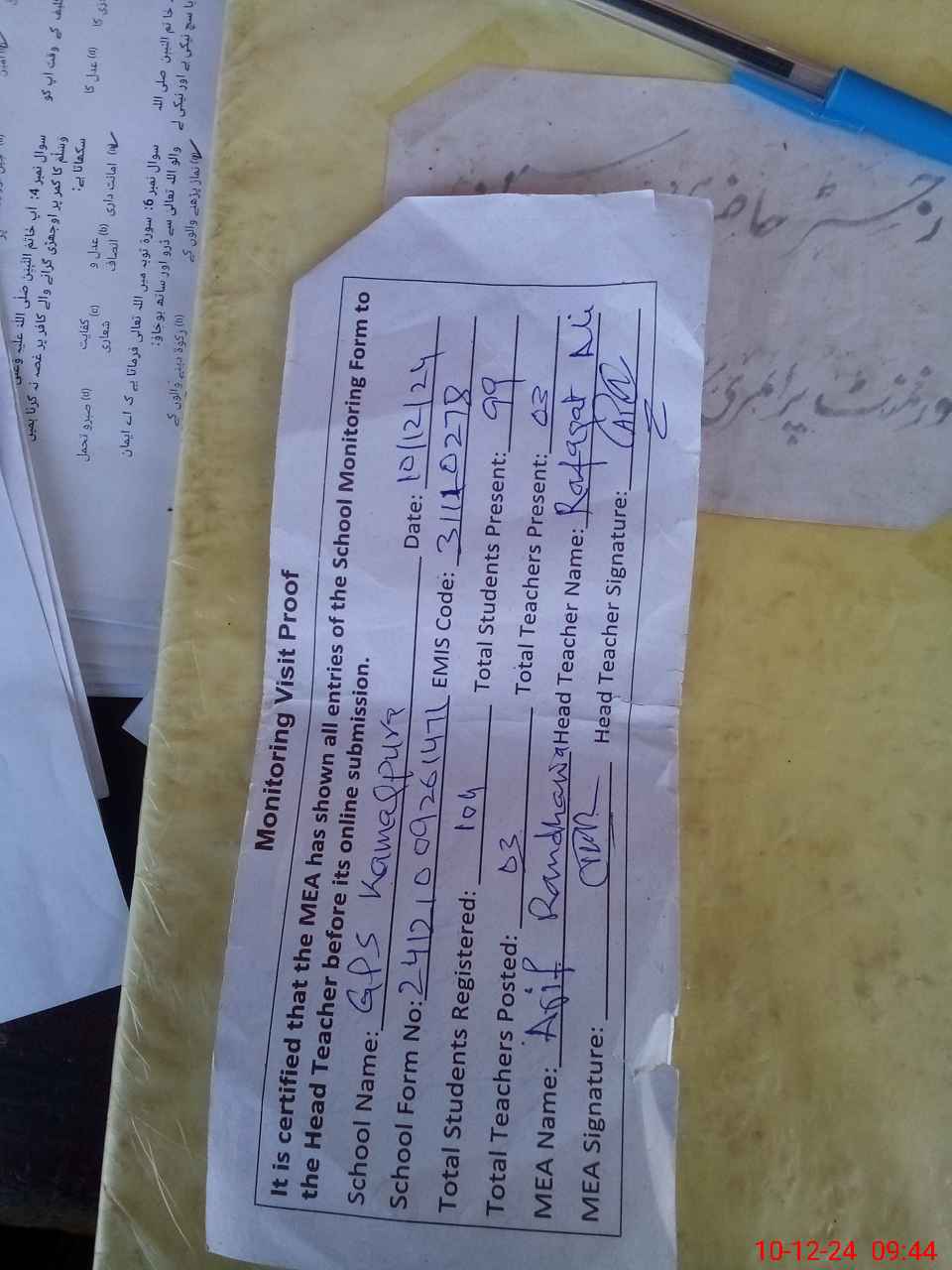 | Attendance Register | Head Teacher | MEA with School | Visit Proof |