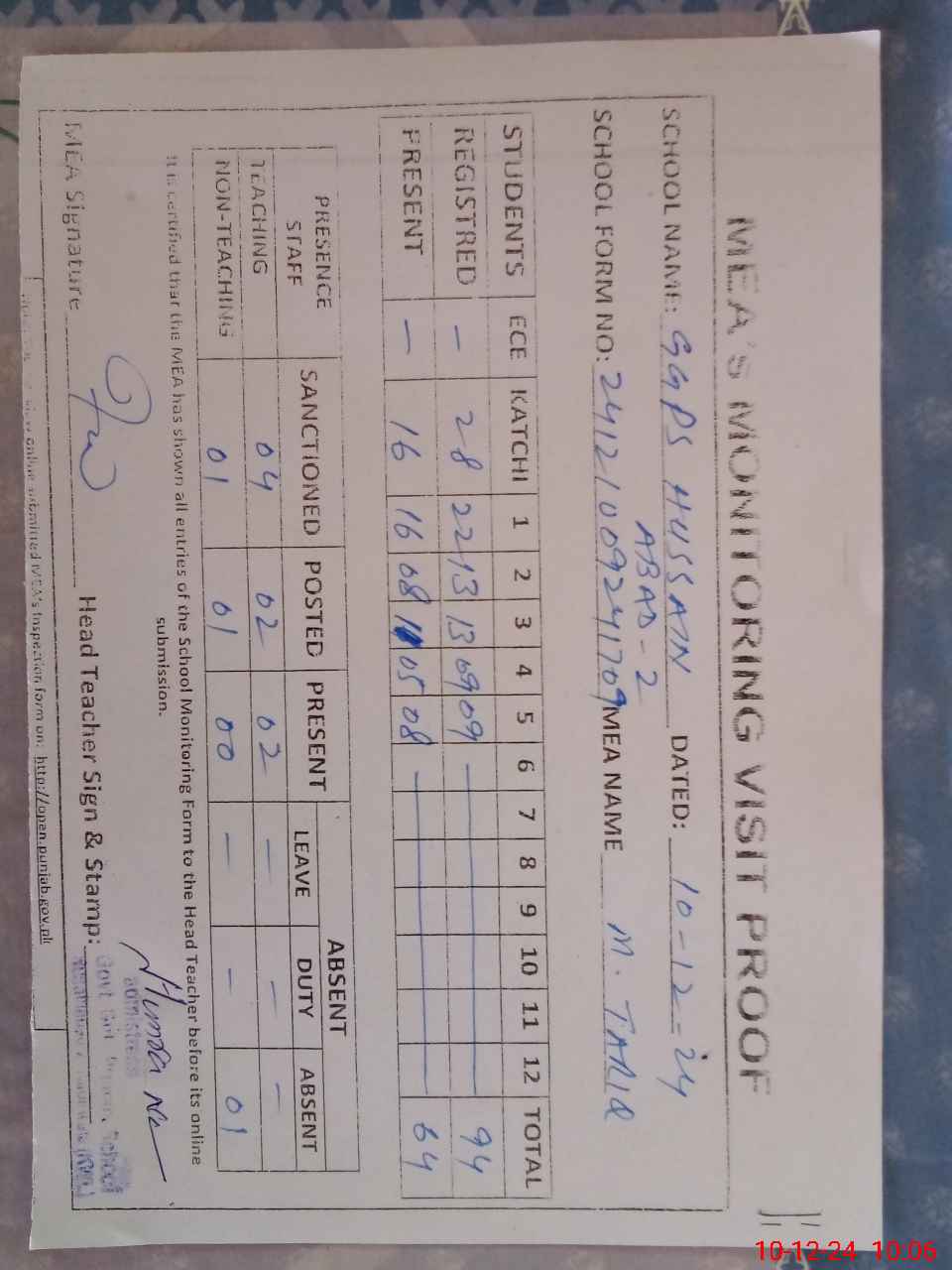 | Attendance Register | Head Teacher | MEA with School | Visit Proof |