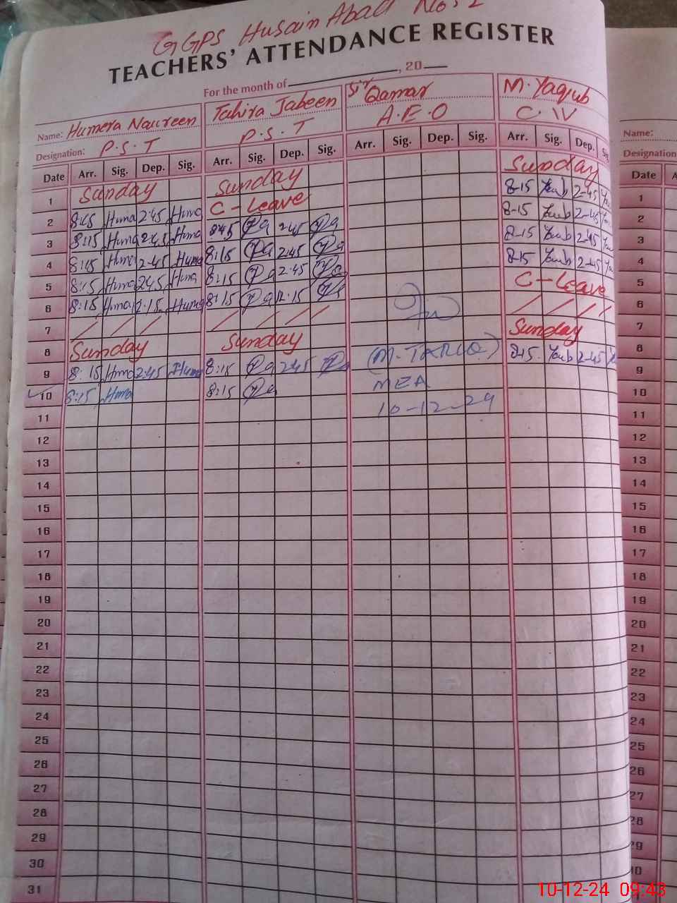 | Remarks (Use Separate Page if Required): C IV M Yaqoob came late to school at about 0930 hrs School council meeting record is not maintained properly | |||||