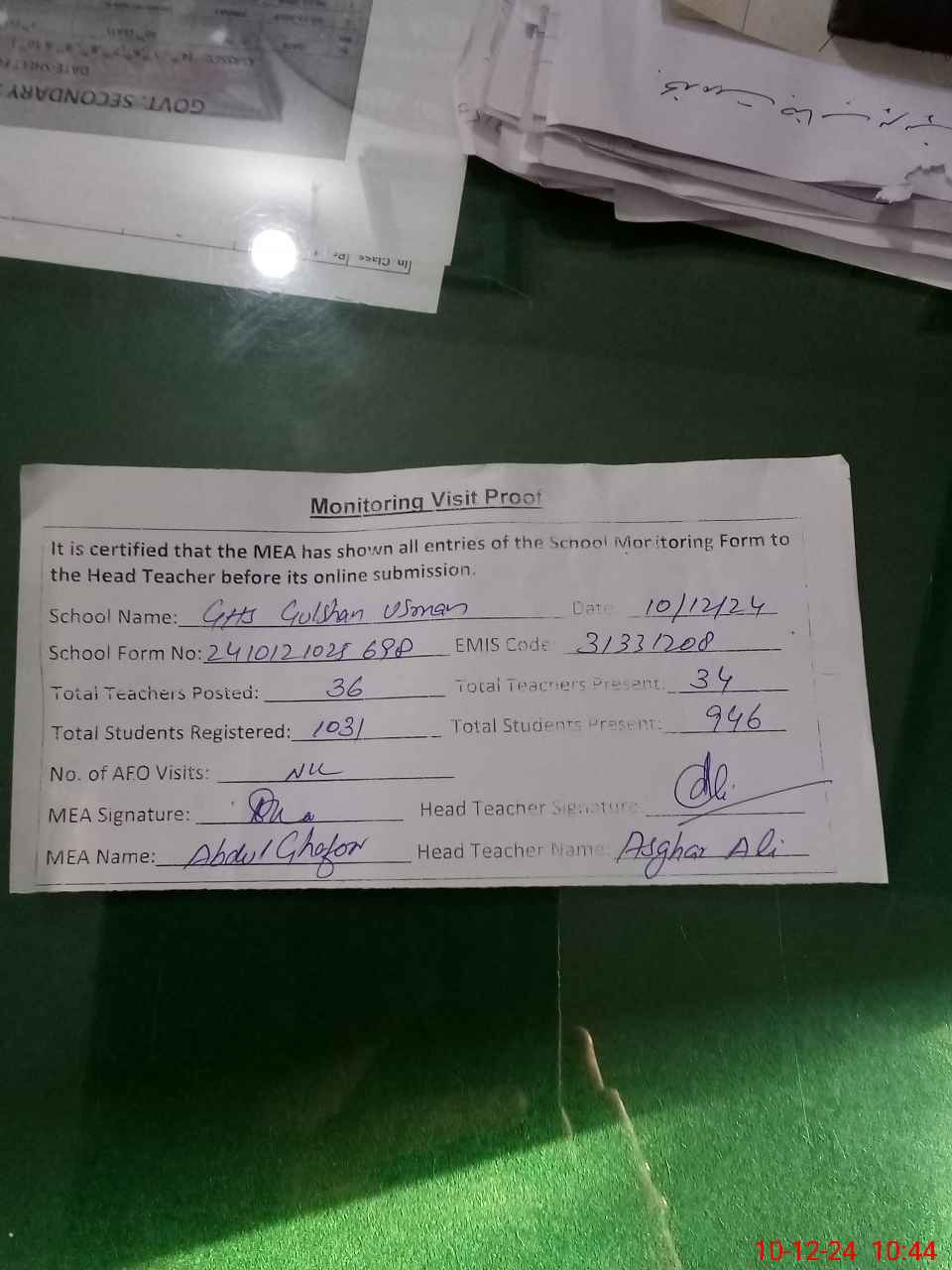 | Certified that this School was Inspected by the Undersigned MEA/DMO Today and the Information Stated Above is as Per Record. | |||||