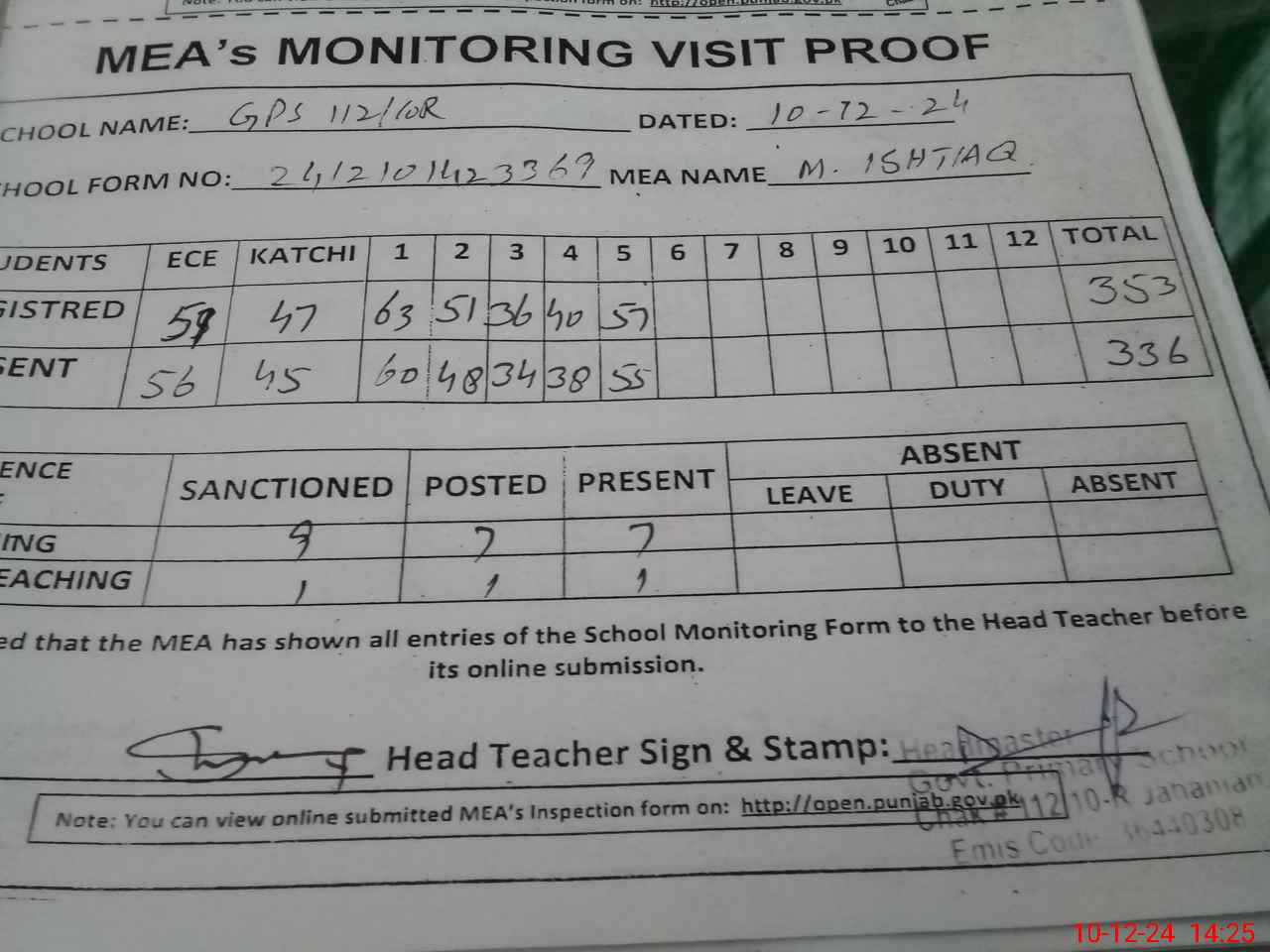 | Attendance Register | Head Teacher | MEA with School | Visit Proof |