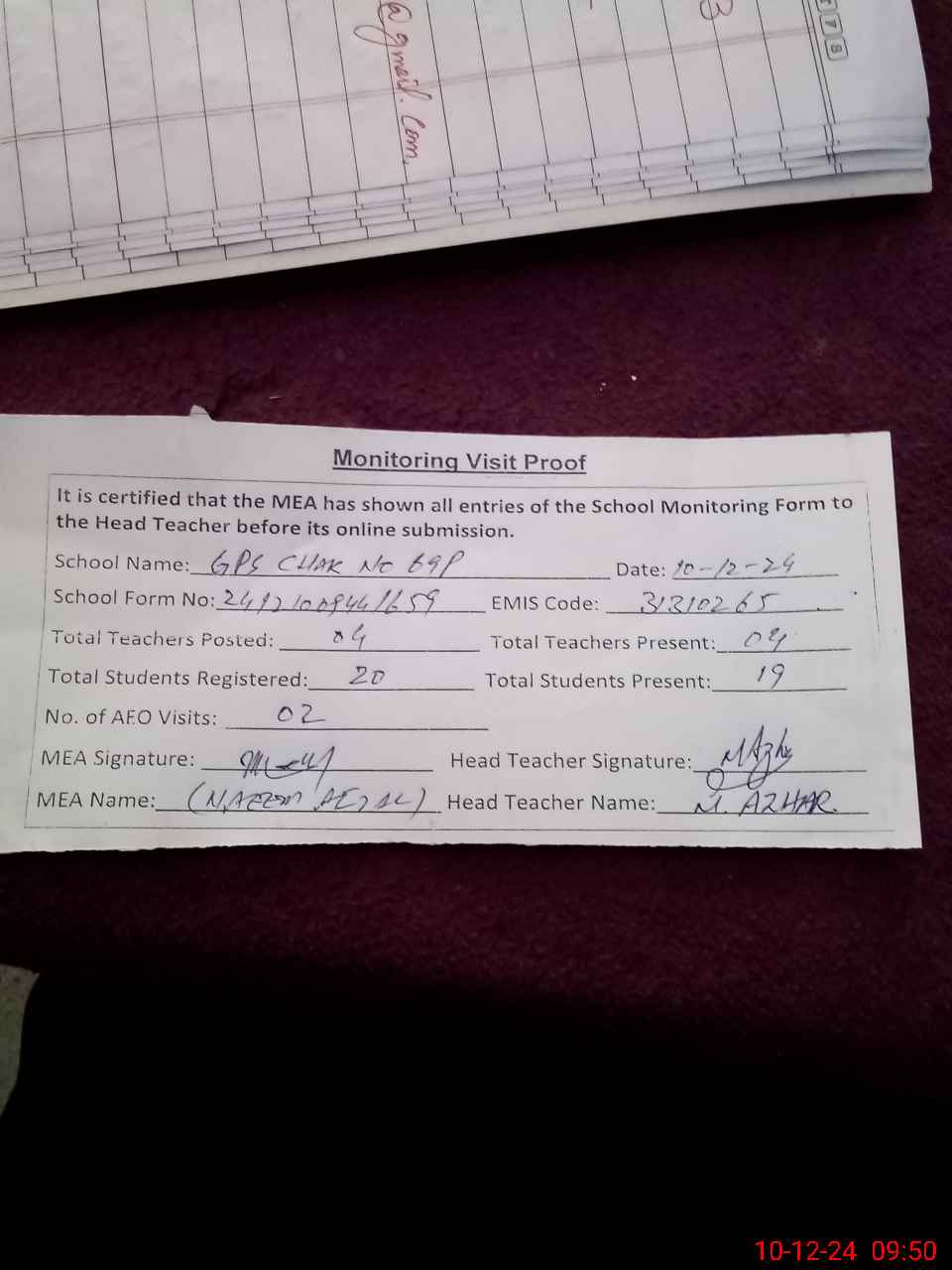 | Attendance Register | Head Teacher | MEA with School | Visit Proof |