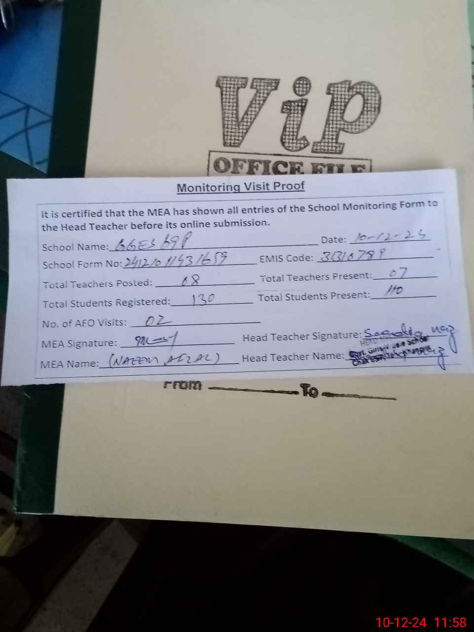 | Attendance Register | Head Teacher | MEA with School | Visit Proof |