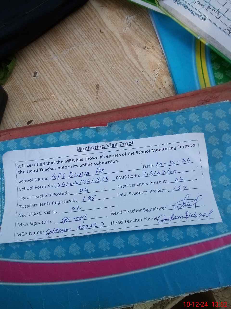 | Attendance Register | Head Teacher | MEA with School | Visit Proof |